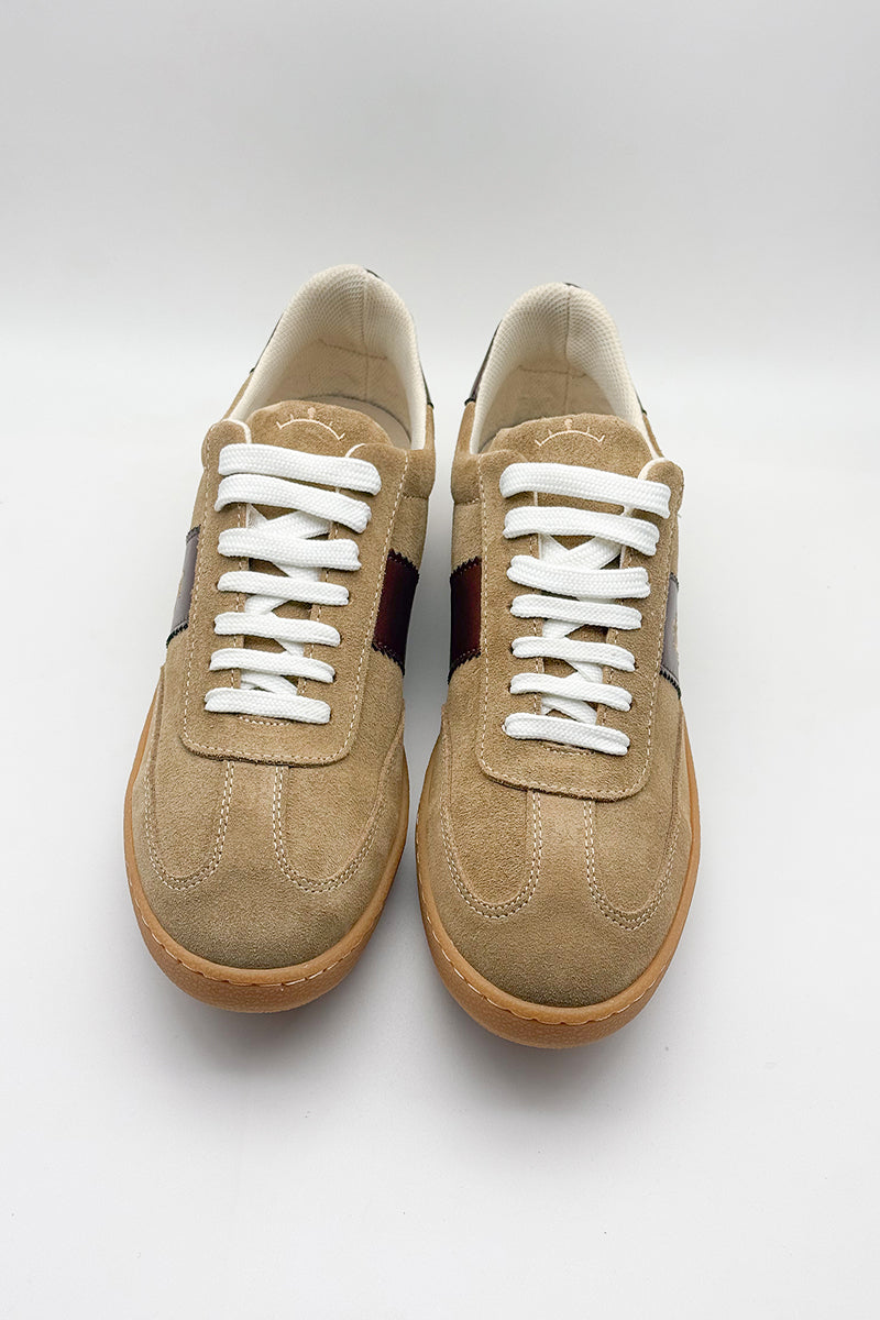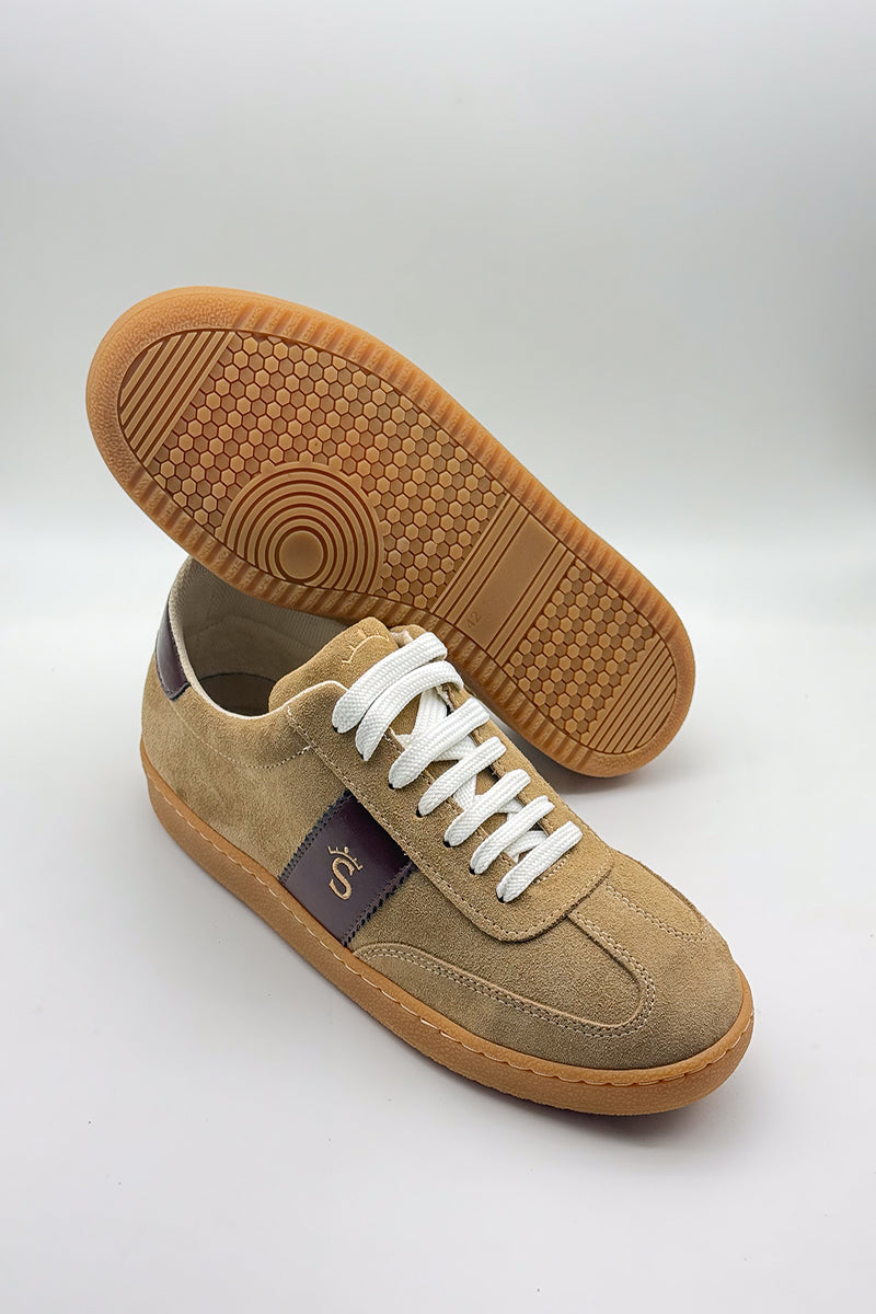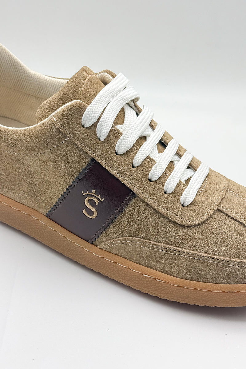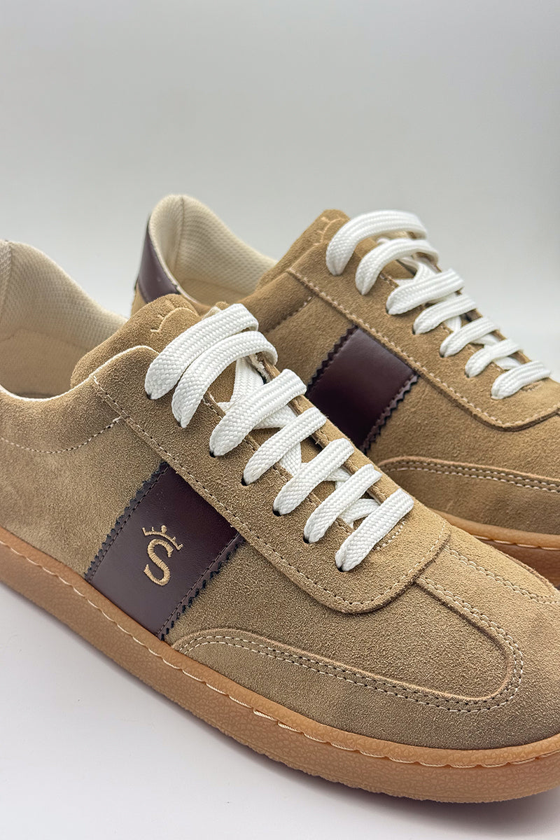 Men's athletic shoe crafted from premium suede in a natural leather tone, enhanced with chocolate brown leather accents. The design is complemented by a gold-thread embroidered logo, adding a touch of distinction to this versatile and premium-finish shoe.