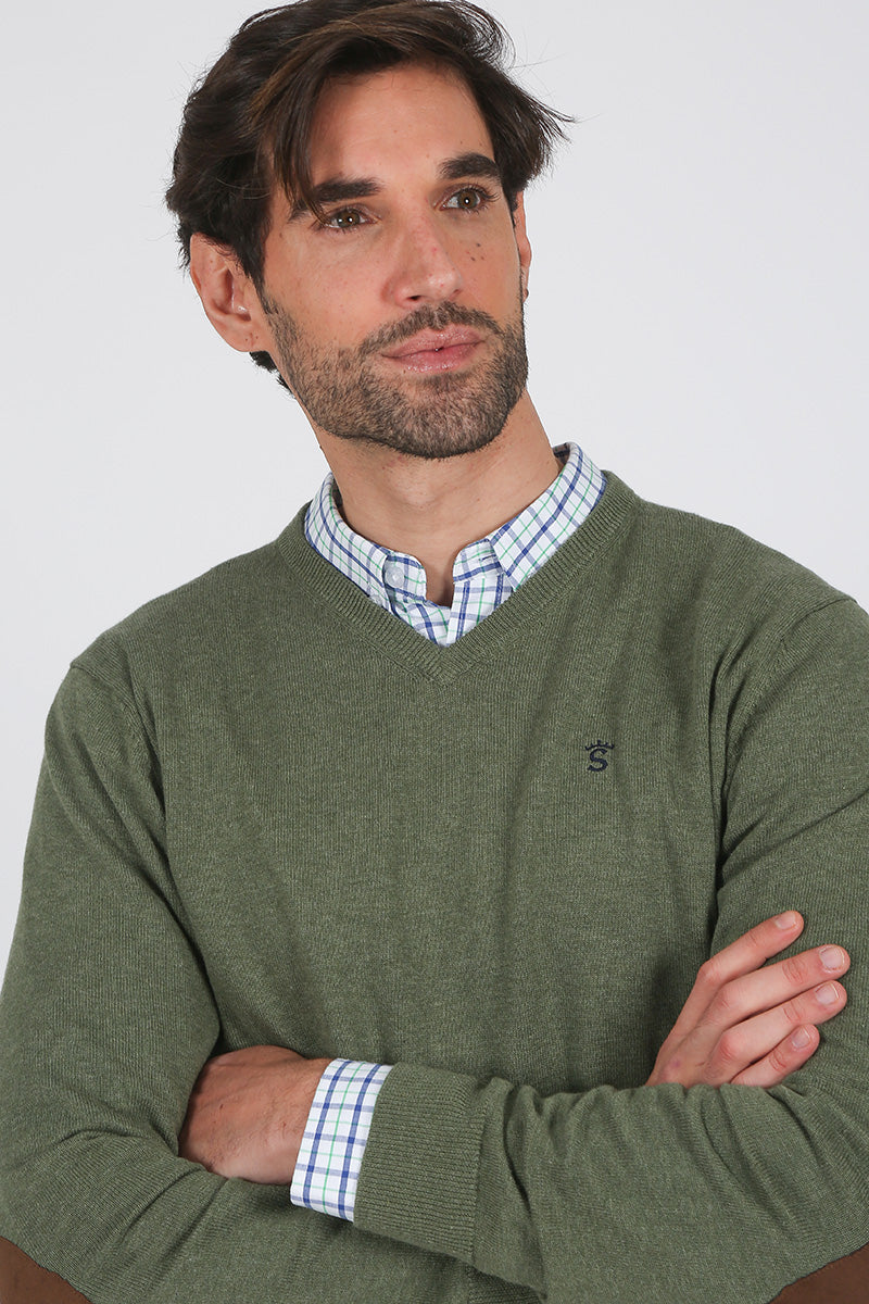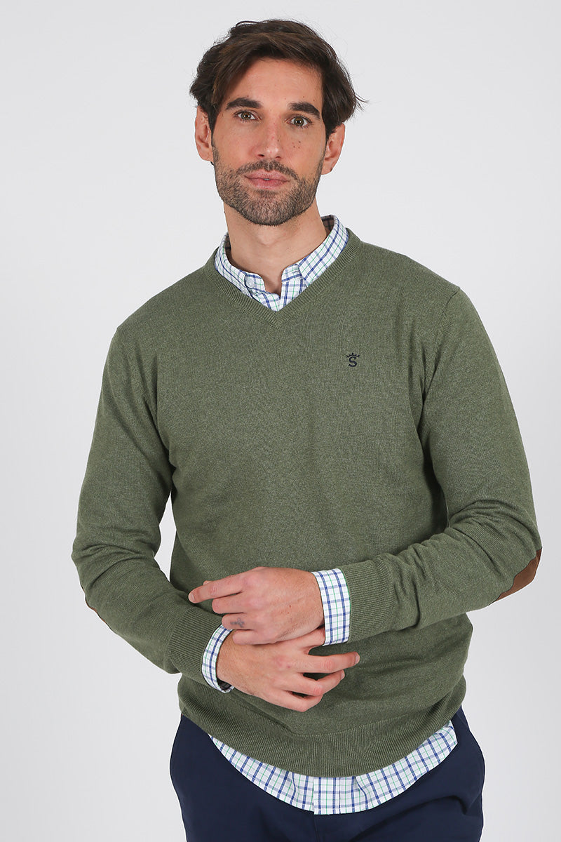 Jersey verde con cuello pico tricot galga 12, con logo bordado en pecho en marino, diseñado para un estilo elegante y atemporal. Incorpora parches en los codos en color marrón que aportan un toque clásico y distintivo. Ideal para combinar con camisas y lograr un look casual refinado.