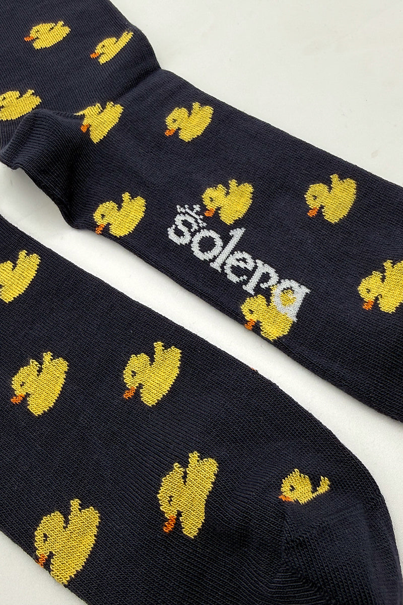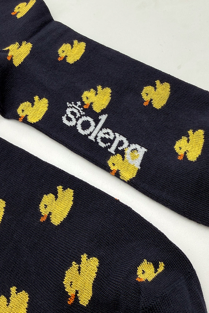 Estos calcetines marino presentan un divertido motivo de patitos de goma, aportando un toque original y fresco a tu estilo diario.