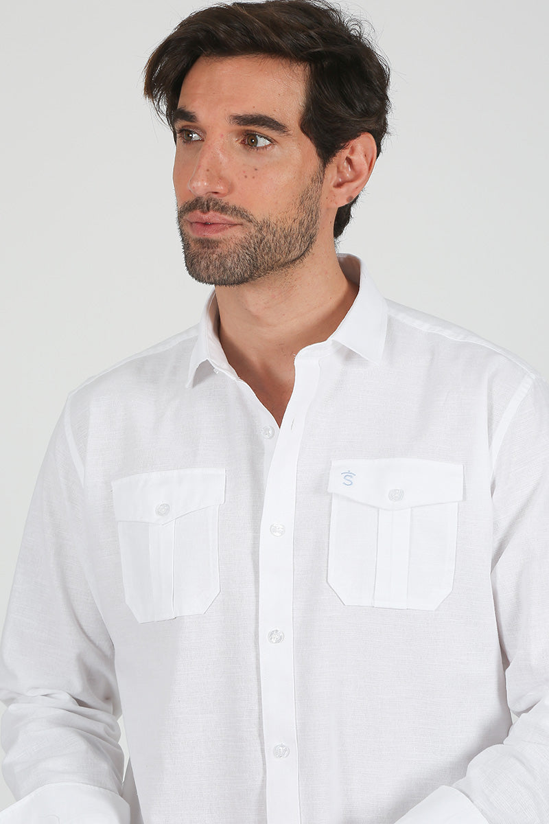 Camisa Safari blanca, confeccionada en una mezcla de lino y algodón con un suave acabado lavado que proporciona comodidad y transpirabilidad. Diseñada con doble bolsillo con solapa en el pecho y cuello sin abotonar para un estilo relajado y versátil. La prenda luce el logo bordado en la solapa del bolsillo en azul, añadiendo un toque de distinción. Perfecta para crear looks casuales con carácter.