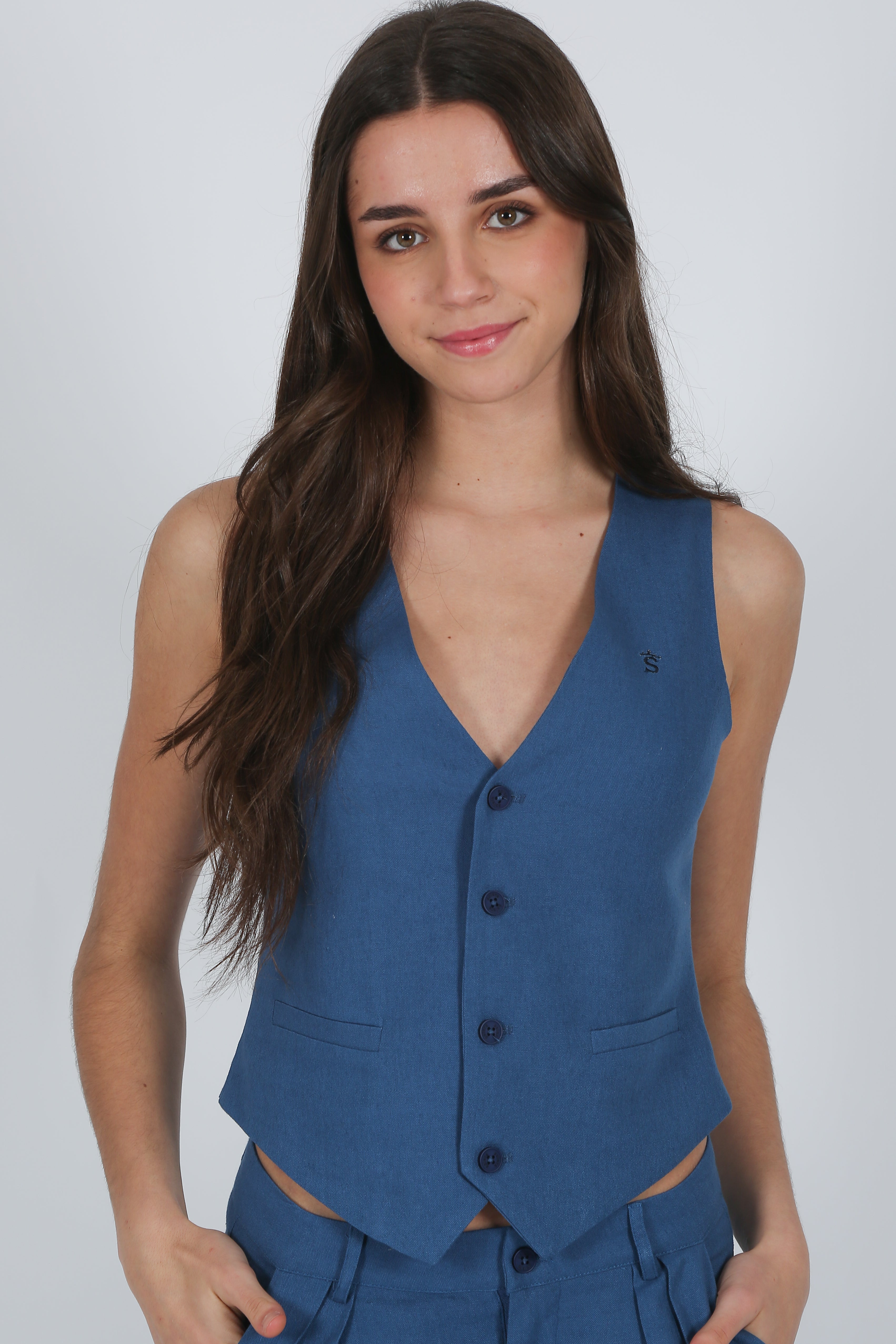 Chaleco de corte entallado en tono azul, con escote en pico y cierre frontal mediante botones. Presenta bolsillos de vivo en la parte delantera y un logo bordado en color marino en el pecho. En la parte trasera incorpora un cinturón ajustable que permite adaptar la prenda a la silueta. Ideal para un look elegante y coordinado.