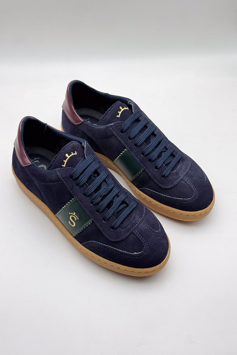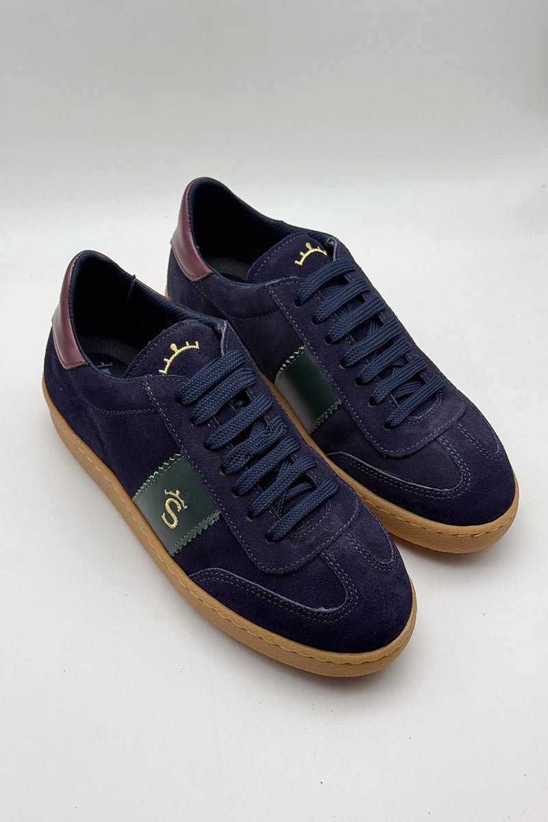 Zapatilla deportiva confeccionada en ante marino de primera calidad, enriquecida con toques de piel en tonos verde y granate que aportan sofisticación. Complementa el diseño el bordado de la marca en hilo dorado, un detalle que refleja la identidad de Solera Moda con elegancia discreta.