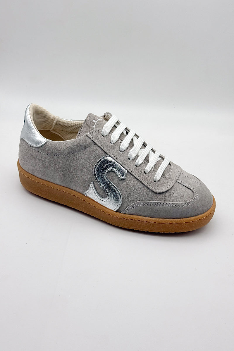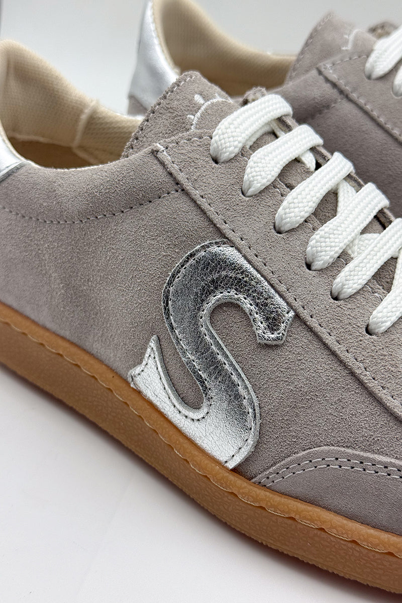 Zapatilla deportiva para mujer confeccionada en piel y serraje gris, combinada con detalles en cuero plateado en la talonera y la zona del talón. Diseño versátil que combina comodidad y elegancia, ideal para un uso diario tanto en looks casual como en propuestas más sofisticadas. La combinación de materiales de calidad garantiza durabilidad y un acabado premium que refleja el estilo náutico y refinado de la marca.