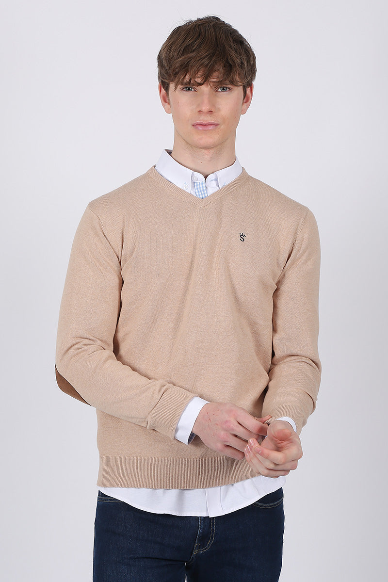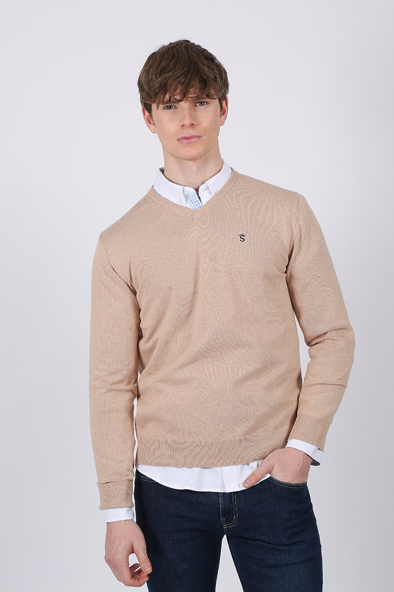 Este jersey de cuello de pico ofrece un diseño elegante y sofisticado, realzado con un bordado sutil de la marca que aporta distinción.