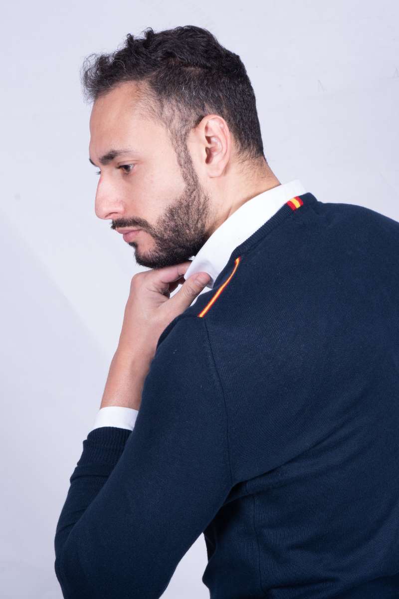 Jersey cuello pico 100% algodón de galga 12, increíble el detalle de la fantasía bandera de España en franja sobre los hombros y en parte trasera de cuello, que convierte a esta prenda en un jersey muy especial, además lleva el logo bordado en pecho al contraste.