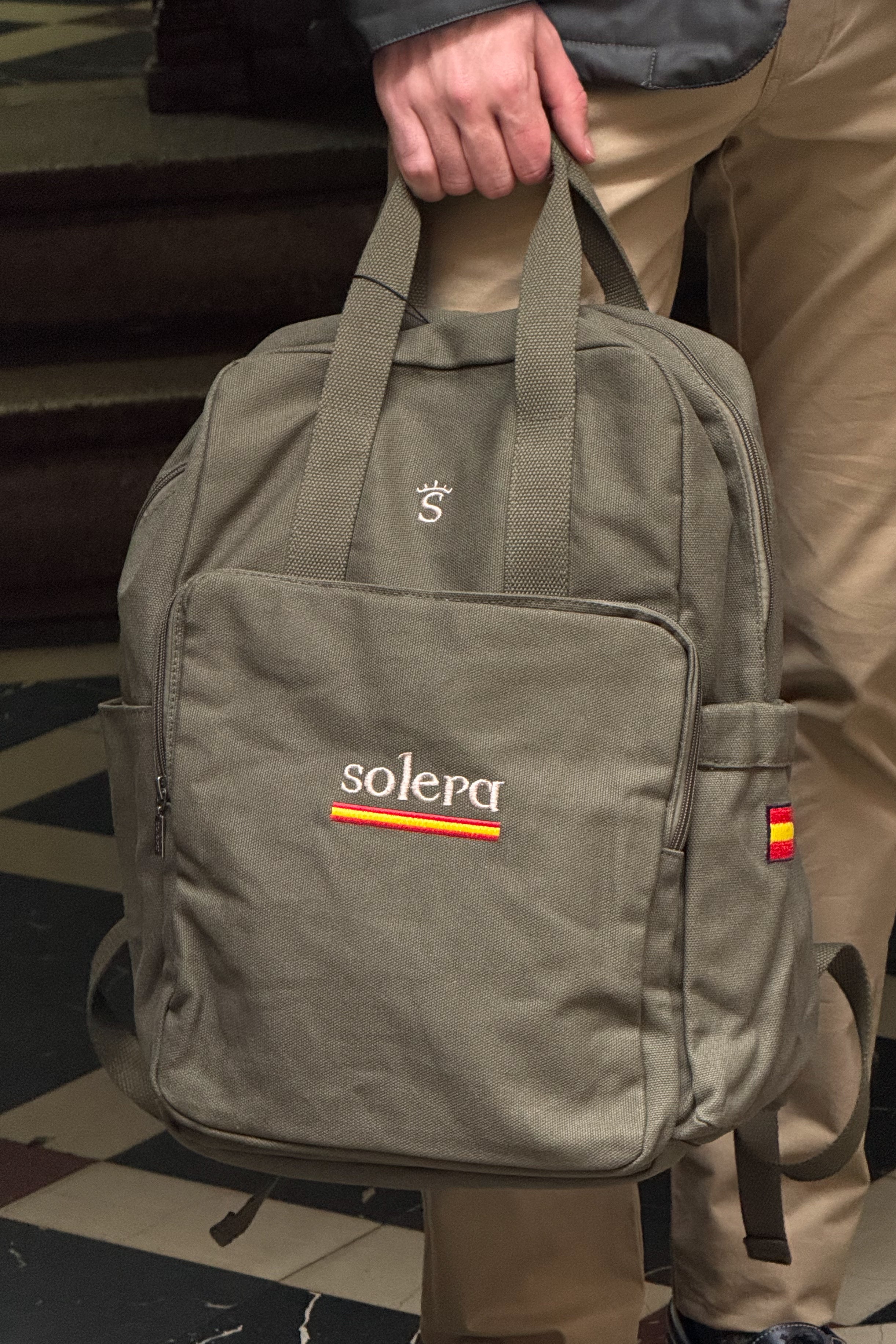 Mochila, 100% Algodón, tu backpack cómoda y versátil para poder llevar con estilo todo lo que necesitas en el día a día, personalizada con 3 bordados de la marca incluyendo parche con la bandera de España en el lateral