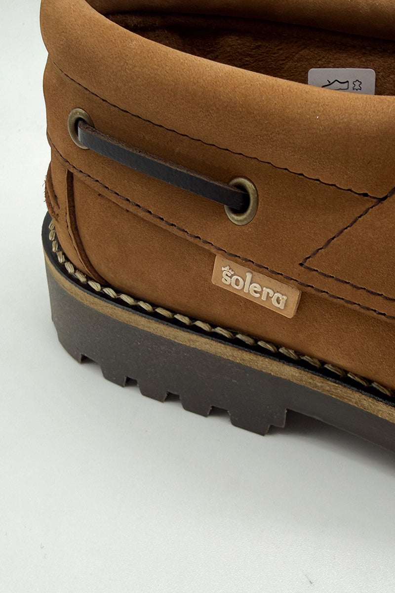 Náutico de nobuk camel con cordón de cuero genuino y suela térmica aislante. Este calzado combina la elegancia clásica del estilo marinero con funcionalidad práctica para los meses más fríos. El nobuk ofrece una textura suave y resistente, mientras que la suela especializada proporciona aislamiento térmico sin comprometer la flexibilidad. Ideal para quienes buscan un zapato versátil que transita sin esfuerzo entre lo casual y lo sofisticado, manteniendo los pies cálidos y cómodos.