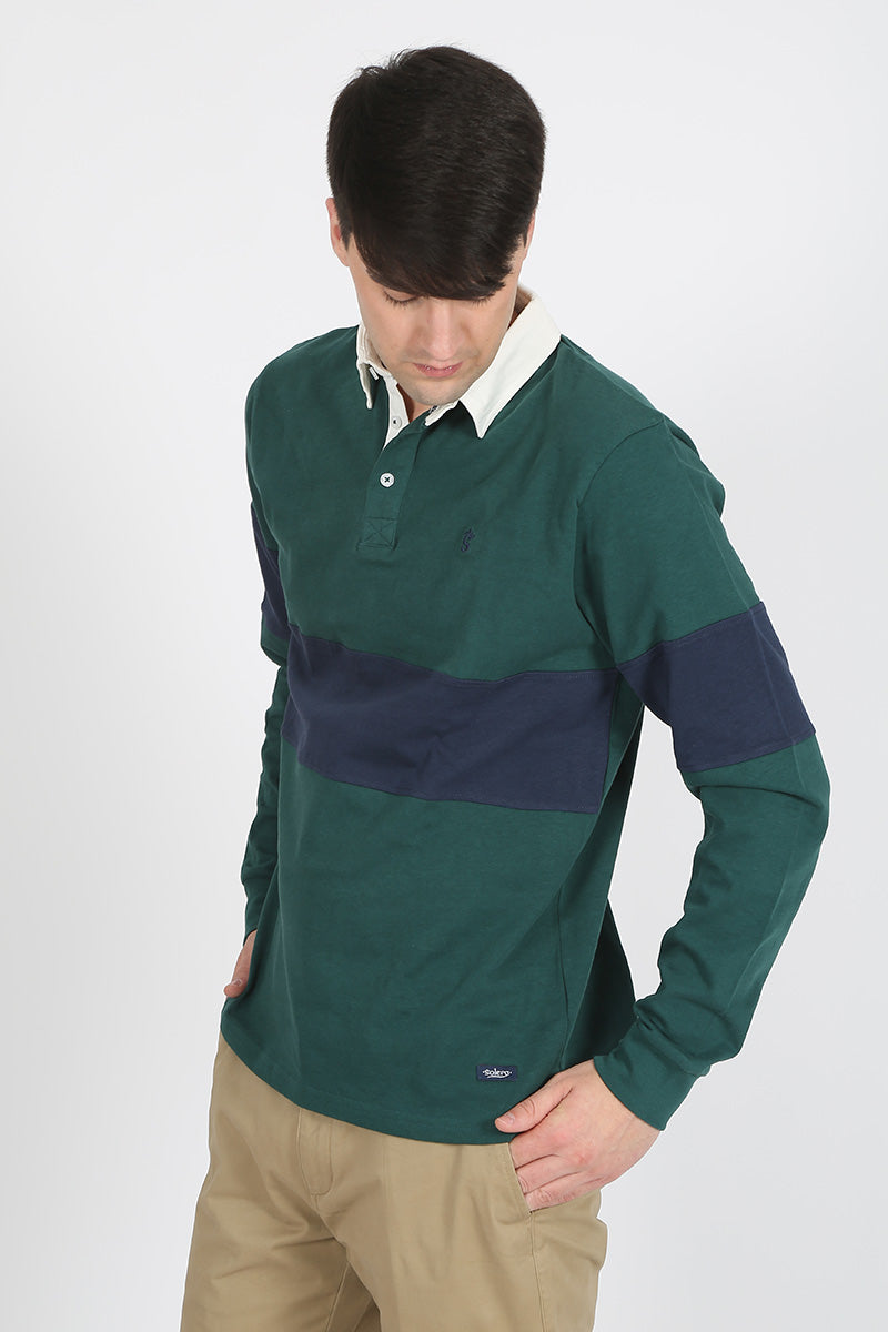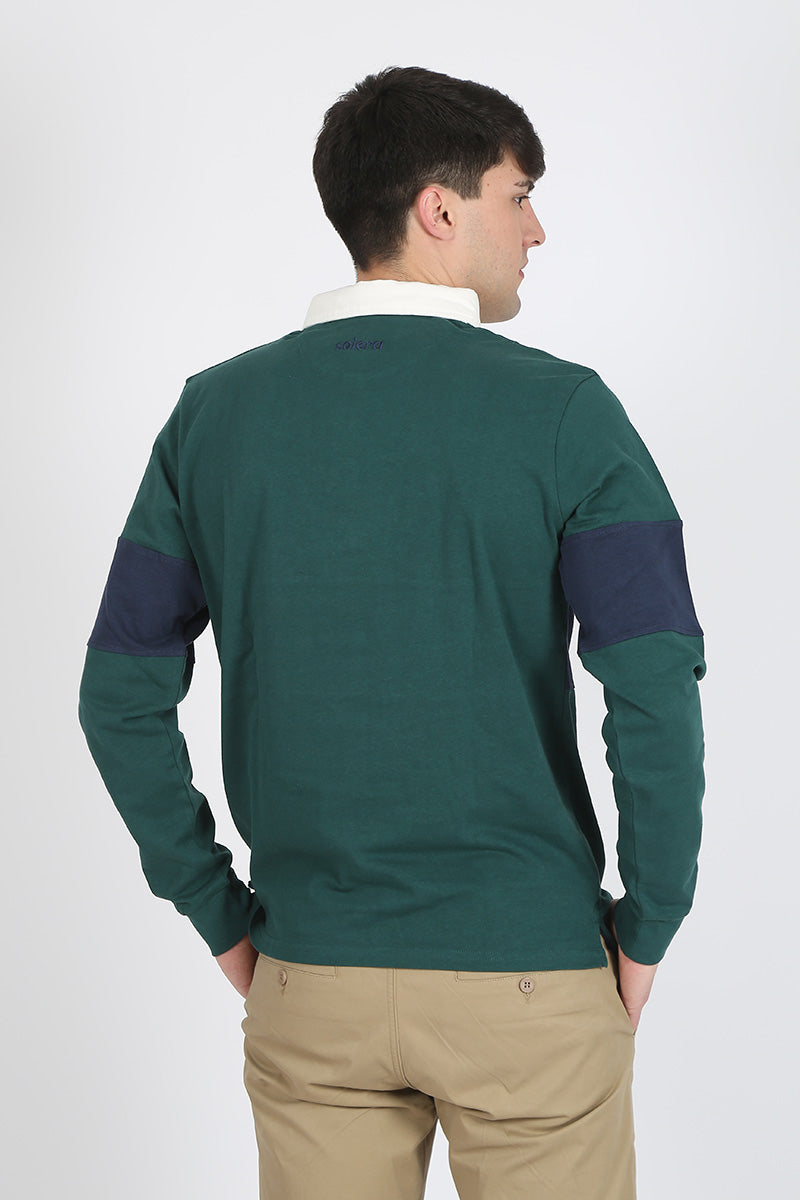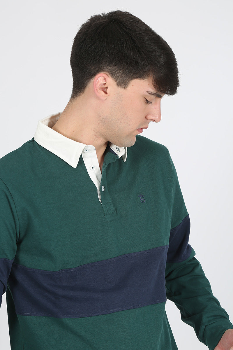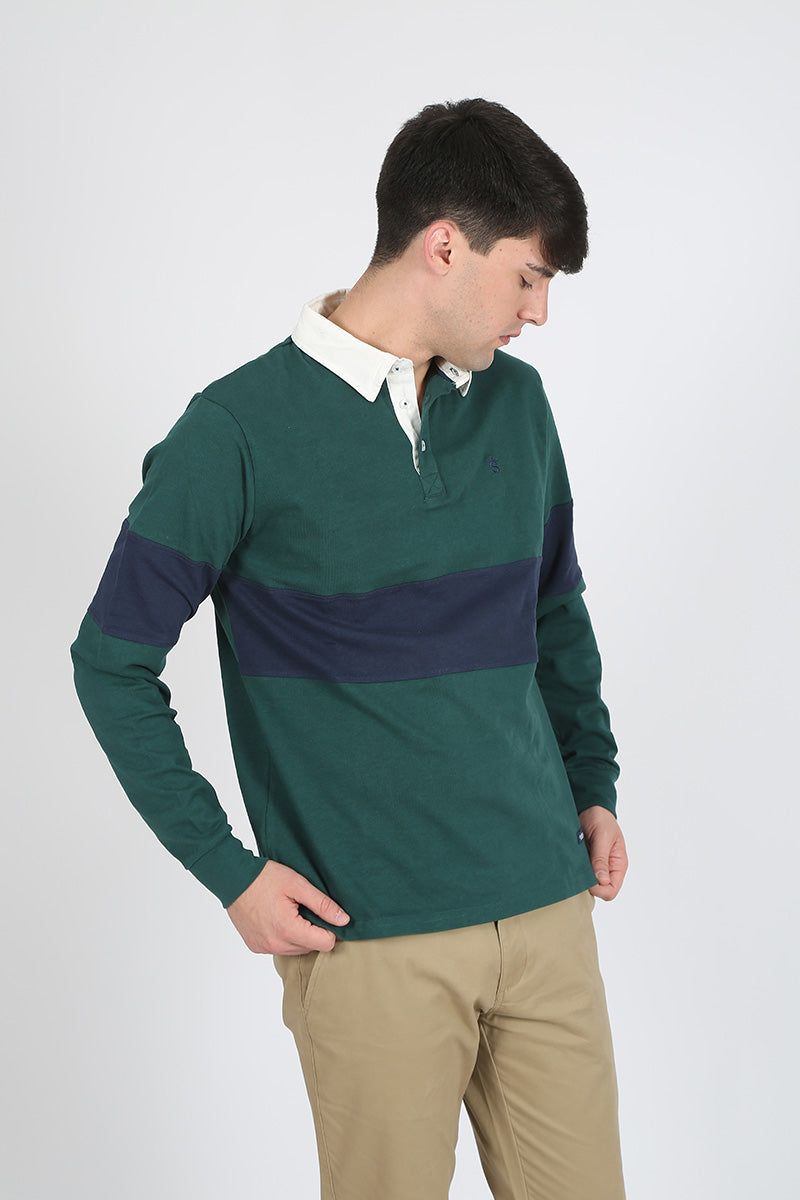 El Polo Franja Marino tipo rugby, presenta un tejido de punto liso extragrueso con una raya en contraste, acompañado de un cuello de lona gruesa. El logotipo bordado en el pecho y la espalda añade un toque de sofisticación.