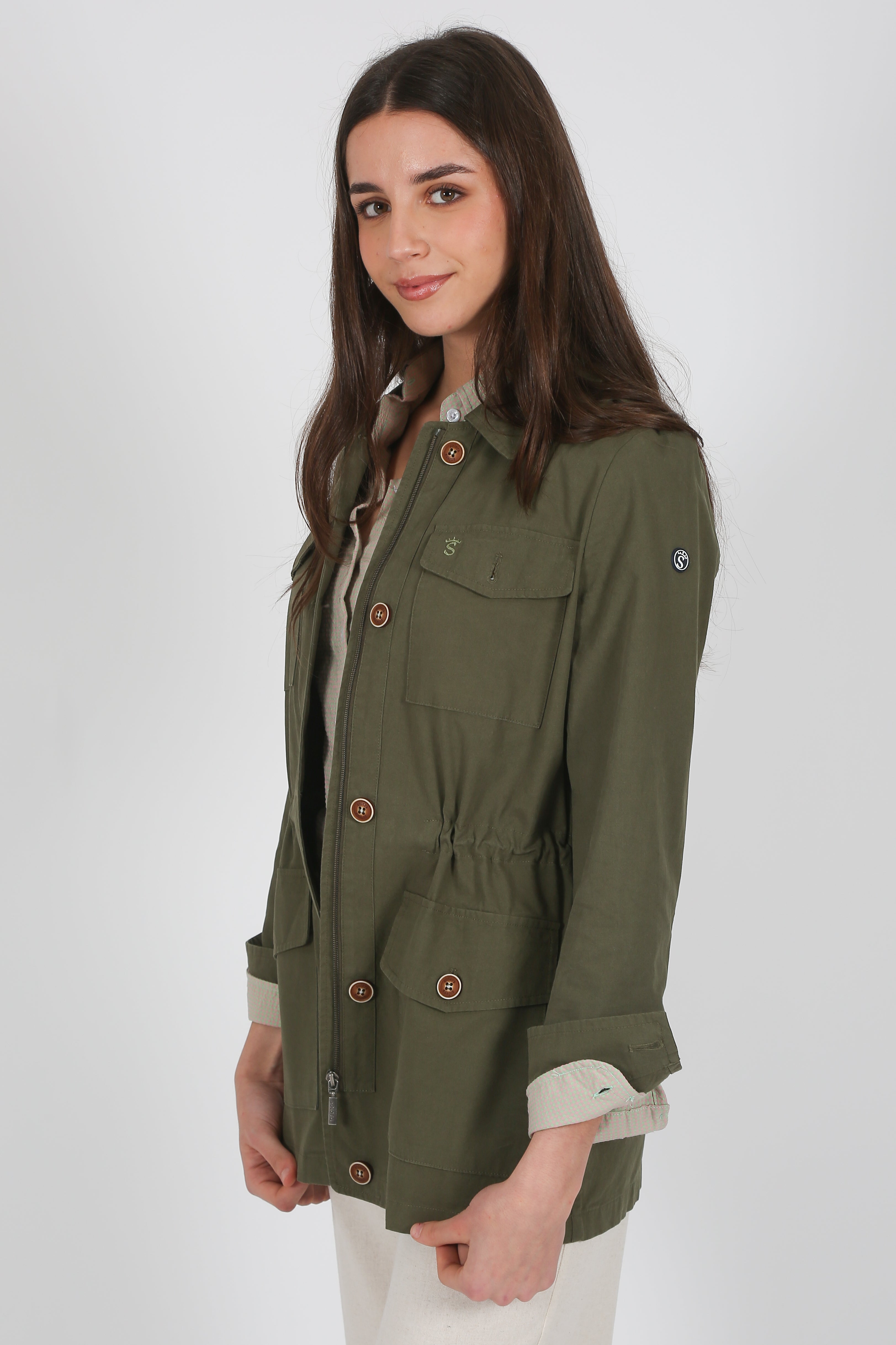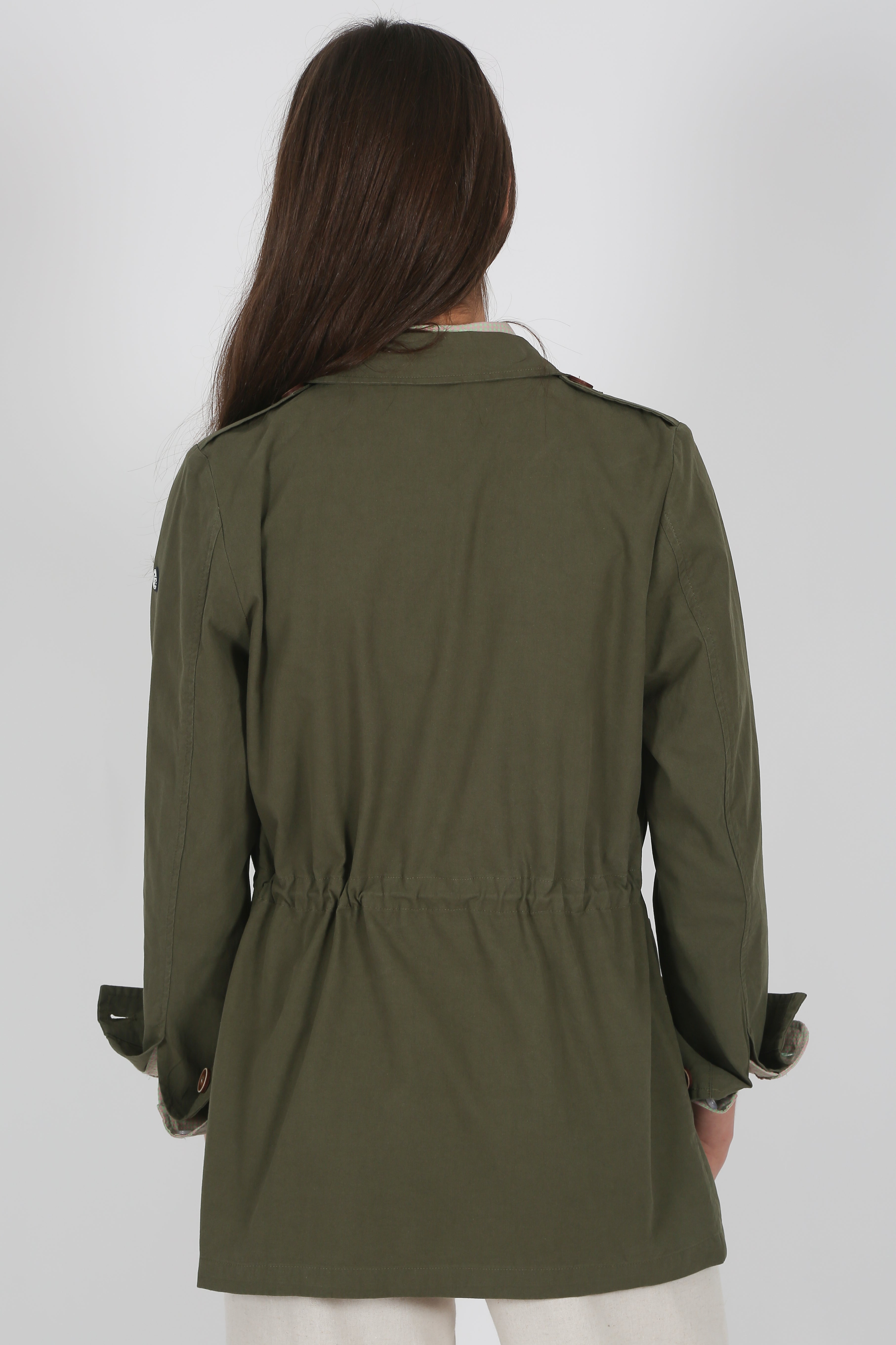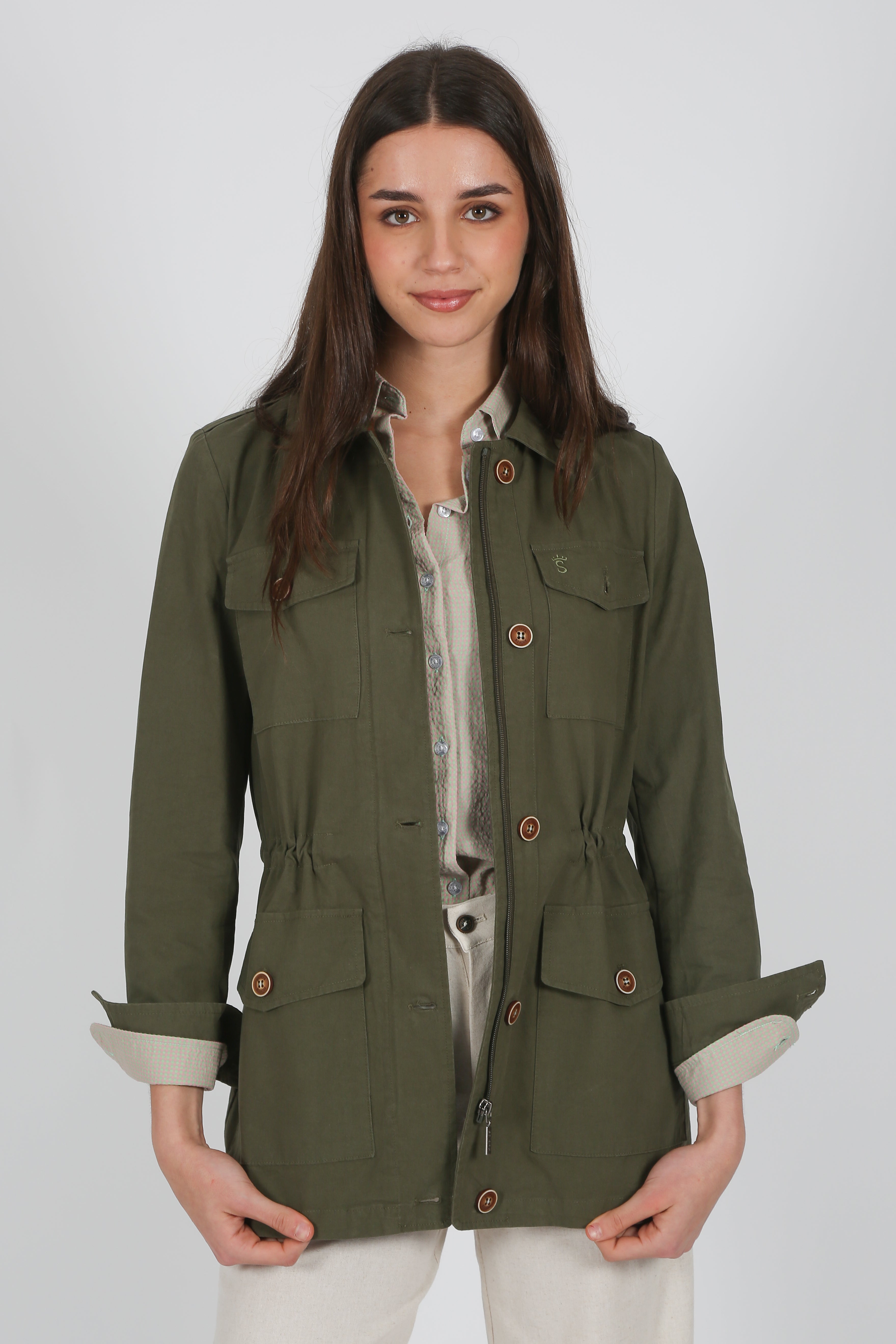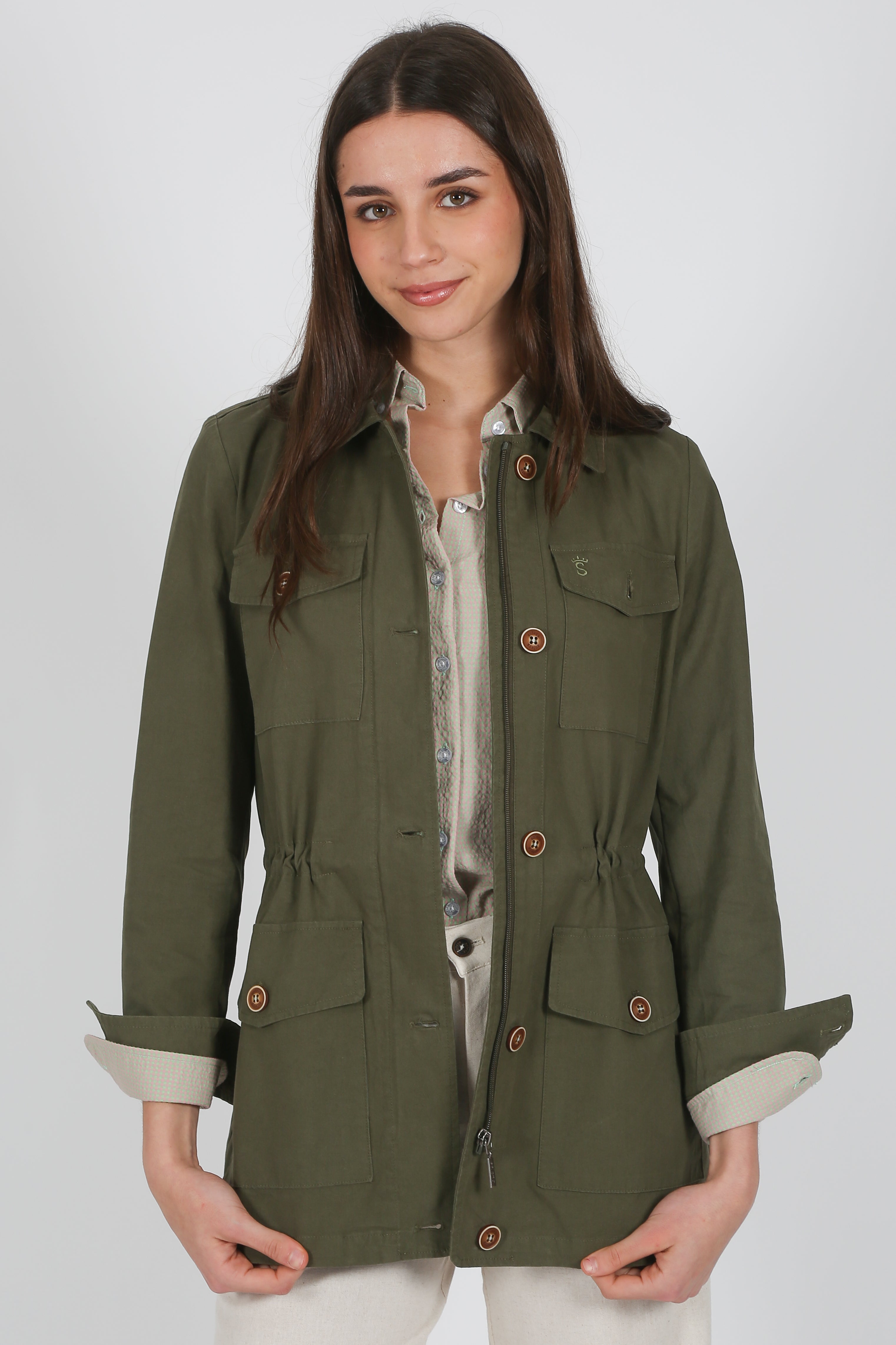 Sahariana verde de algodón lavado, con elastano para mayor comodidad. Estilo safari con sus cuatro bolsillos de fuelle con tapeta, cuenta con botones y tirador de cremallera personalizado, cordón en cintura para un ajuste perfecto. Resaltan sus dos bordados de la marca en bolsillo en verde y también en el canesú de la espalda.