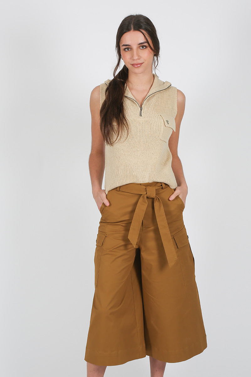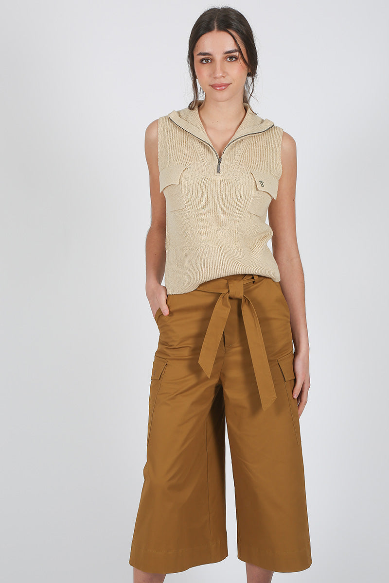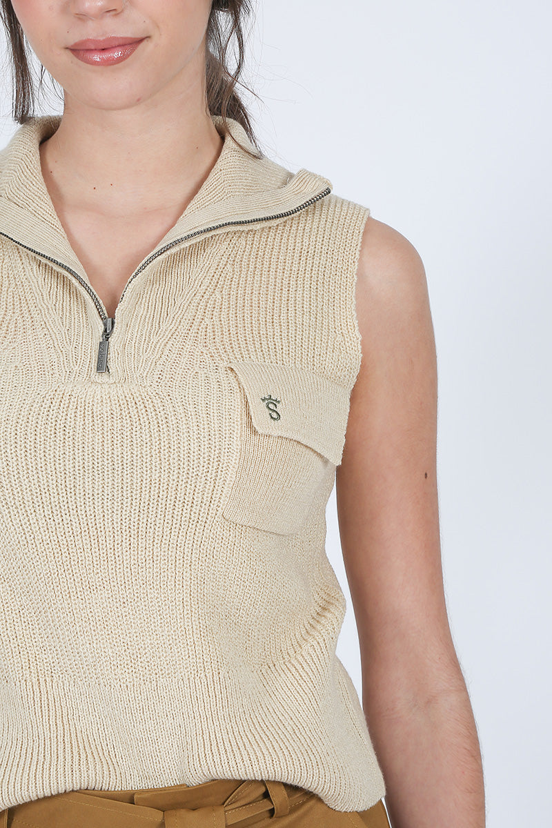 Chaleco de punto en tono beige, de corte recto y sin mangas. Presenta cuello con cremallera corta tipo polo y textura acanalada que aporta relieve. Incluye bolsillos delanteros de parche con solapa y detalle de logo bordado en color marino en uno de ellos. Una prenda versátil y cómoda, ideal para looks casuales con un toque sofisticado.
