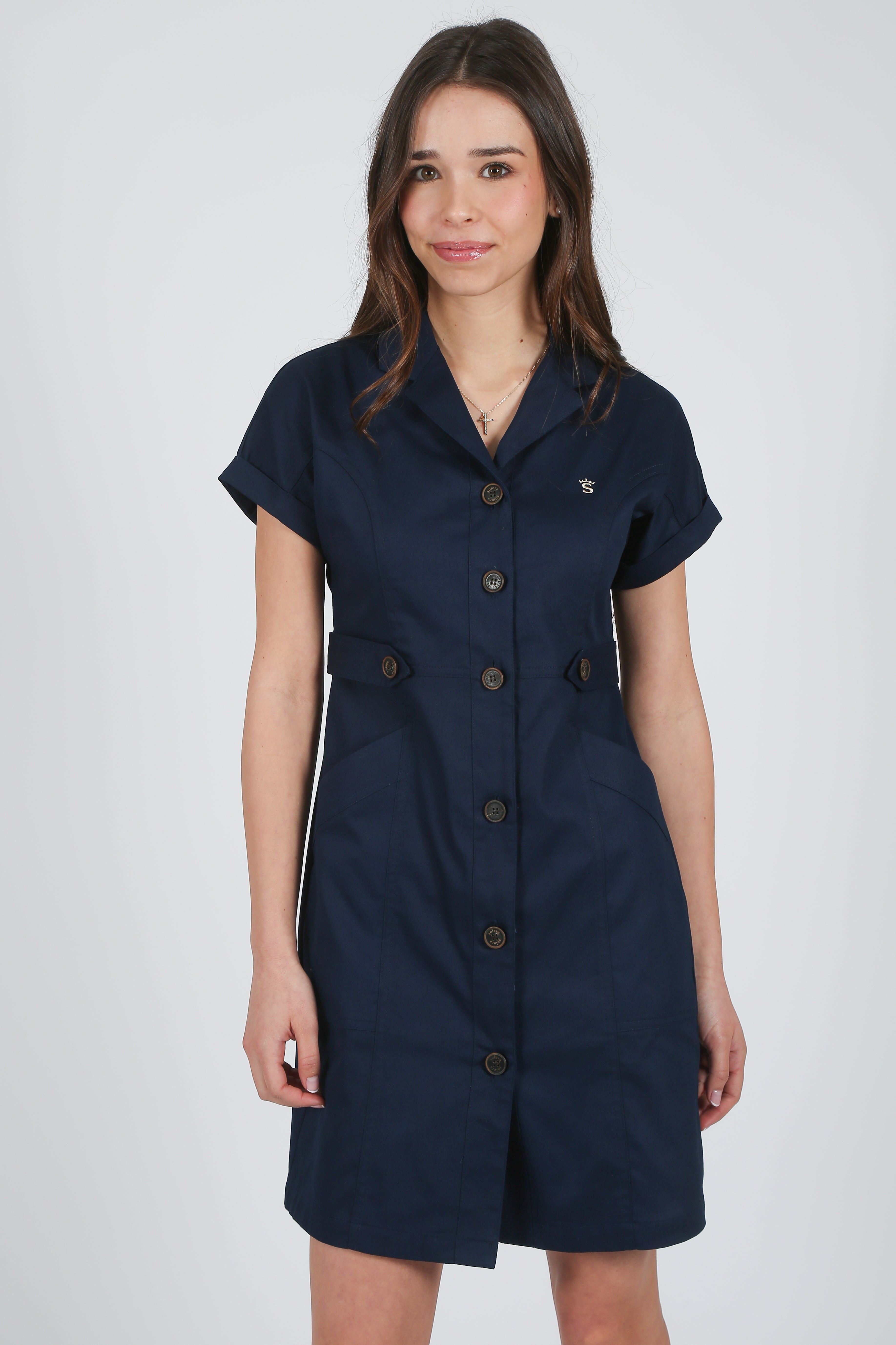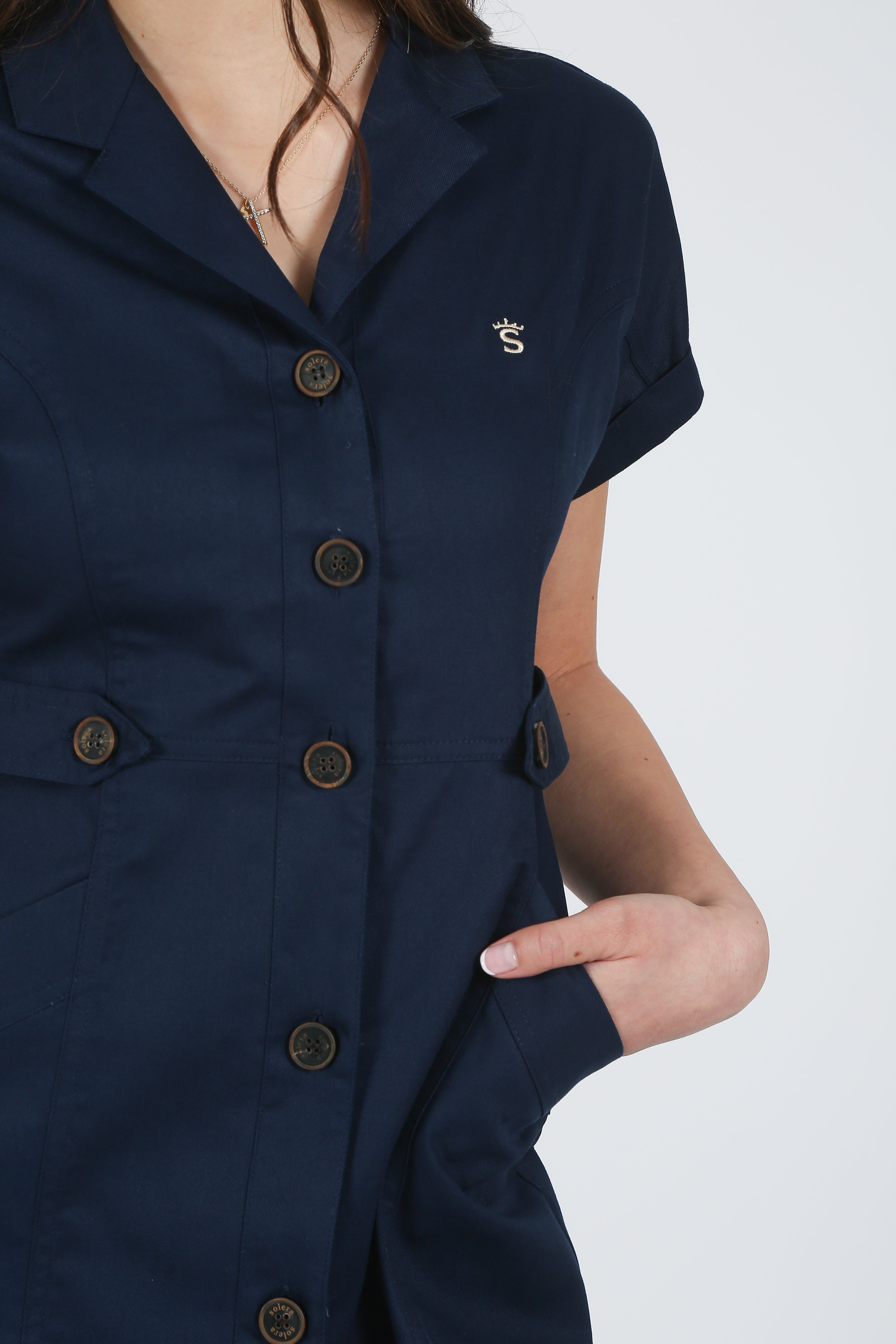 Vestido de mujer en marino de tela tipo vaquera que combina comodidad y estilo. Diseño de manga corta perfecto para las estaciones cálidas, complementado con dos botones funcionales en la espalda que permiten ajustar el fit a tu medida. Una prenda versátil ideal para crear looks casuales y desenfadados con facilidad.